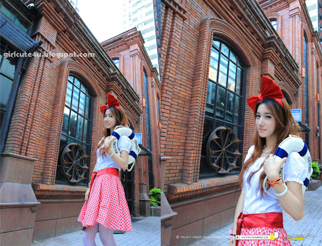 No idea who this model is but this set is titled Alice Walk in City by the photographer and it fits well with Fishnet Friday The model is in quite the cute outfit with a oversized bow in her hair, red and white skirt, white top and white fishnets.